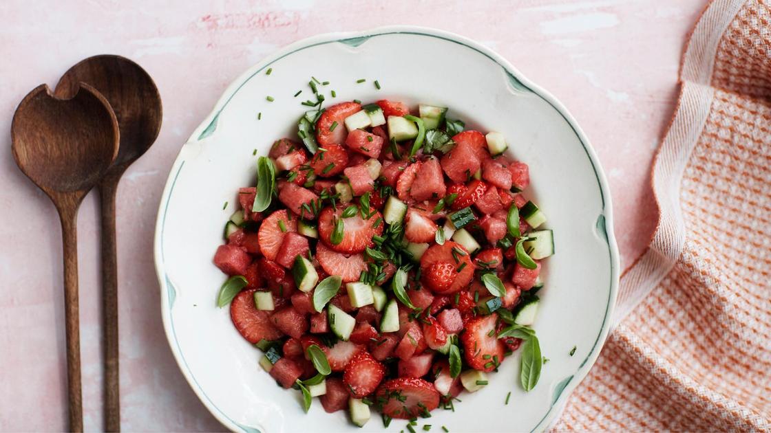 Vesimelonista, mansikoista ja kurkusta valmistettu salsa on kesäruokien raikas kaveri. Tarjoa melonisalsa esimerkiksi grillatun kanan, kalan tai halloumin kanssa.