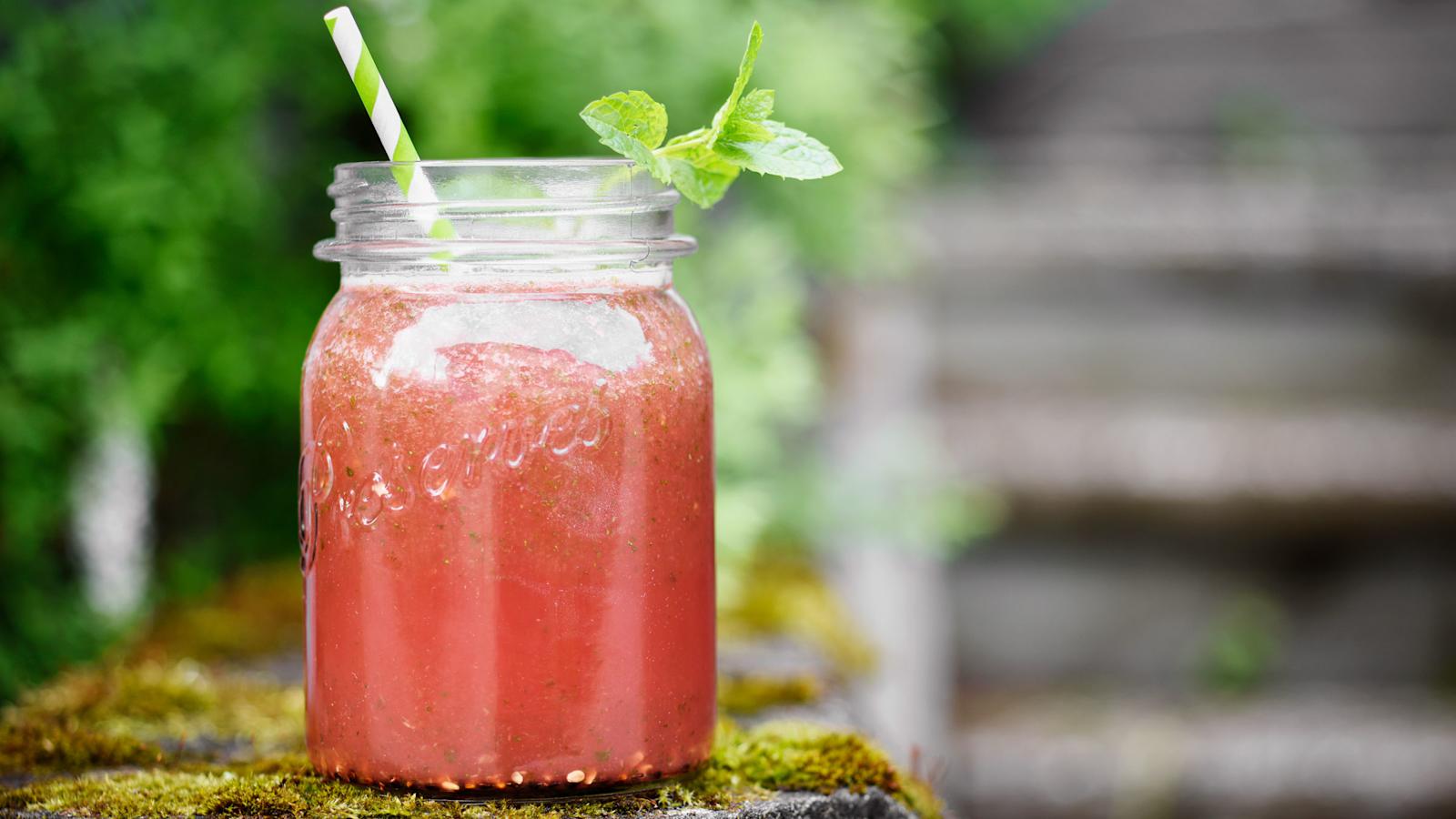 Raikas, mintulla ja basilikalla rikastettu vesimelonivesi on oiva hellepäivän viilentäjä ja vedellä jatkettuna hyvä janon sammuttaja.