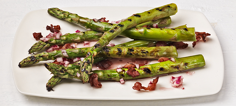 Aseta parsat laakealle lautaselle, valuta punasipulivinaigrette päälle ja ripottele lopuksi rapea pekoni.