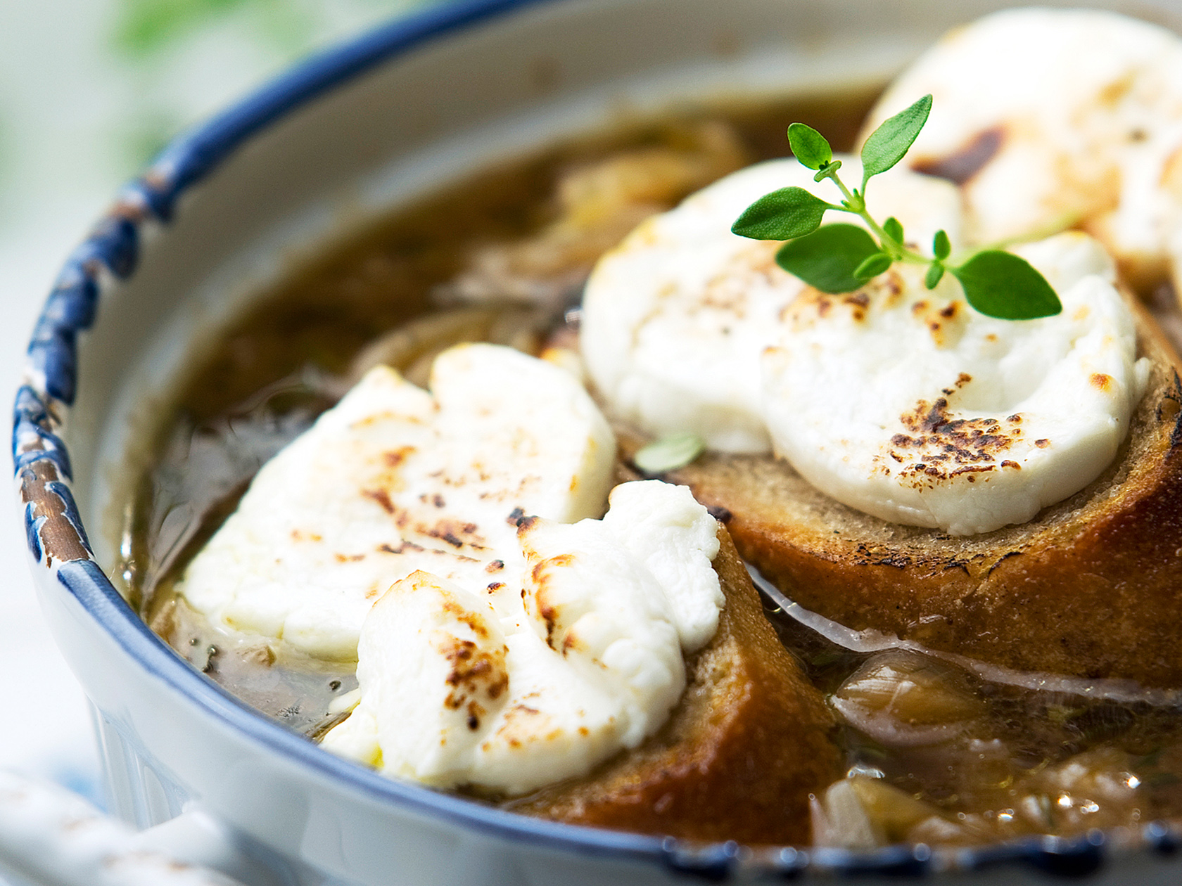 Kuori ja viipaloi sipulit. Kuullota sipuleita öljyssä isossa kattilassa muutama minuutti. Ripottele joukkoon sokeri ja jatka kypsentämistä noin 20 minuuttia niin, että sipulit saavat hieman väriä.Lisää jauhot ja kääntele aineksia muutama minuutti. Lisää joukkoon lihaliemi, viini, laakerinlehti ja timjami. Anna keiton hautua 30 minuuttia välillä sekoittaen.Nosta laakerinlehti pois keitosta ja mausta suolalla ja pippurilla. Nosta leipäviipaleiden päälle viipaloitu vuohenjuusto. Anna leipien gratinoitua muutama minuutti kuumien grillivastusten alla uunissa. Jaa keitto soppakulhoihin ja pane leivät tarjolle keiton pinnalle.