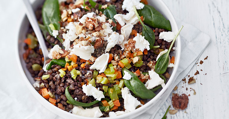 Murusta linssien päälle vuohenjuustoa ja saksanpähkinöitä.