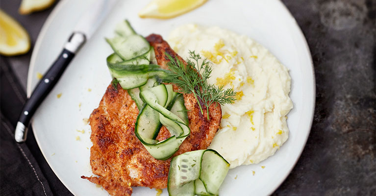 Tarjoile sitruunaperunamuusin, sitruunalohkojen ja mummon kurkkusalaatin kanssa