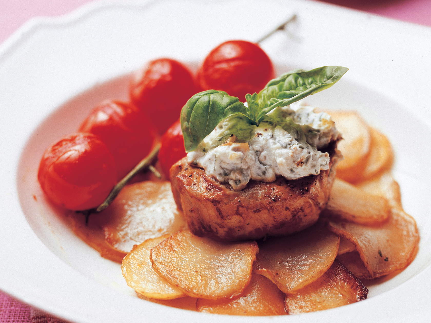 Leikkaa filee kahdeksaksi pihviksi. Hienonna basilikanlehdet ja pähkinät pieneksi silpuksi. Sekoita ne notkistetun vuohenjuuston joukkoon. Lisää halutessasi myös murskattu valkosipuli. Paista pihvit kauttaaltaan kauniin ruskeiksi ja sirottele pintaan kevyesti suolaa ja pippuria. Levitä juustoseos pihveille ja pane pihvit vielä 225-asteiseen uuniin noin viideksi minuutiksi. Tarjoa lisänä valkosipuliperunoita, uunikasviksia tai juureskiusausta.