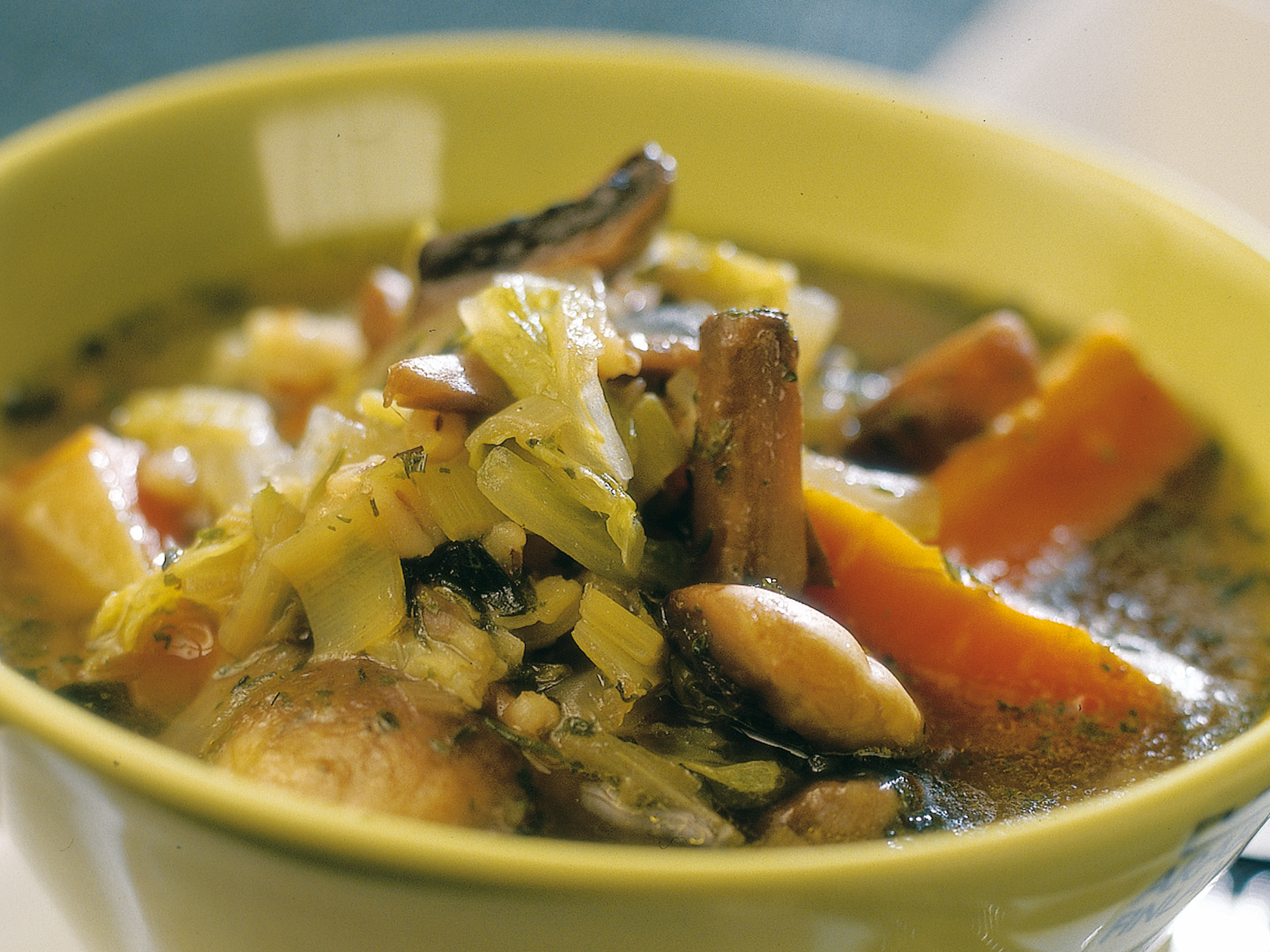 Puhdista ja viipaloi herkkusienet. Kuori ja hienonna sipuli ja valkosipulinkynsi. Puhdista ja leikkaa purjo renkaiksi. Kuori ja leikkaa porkkana tikuiksi. Hienonna kiinankaali. Kuumenna öljy kattilassa ja kuullota kasviksia sekoitellen siinä noin 5 minuuttia. Hienonna basilika. Lisää se ja kaikki loput ainekset kattilaan. Keitä noin 25 minuuttia.