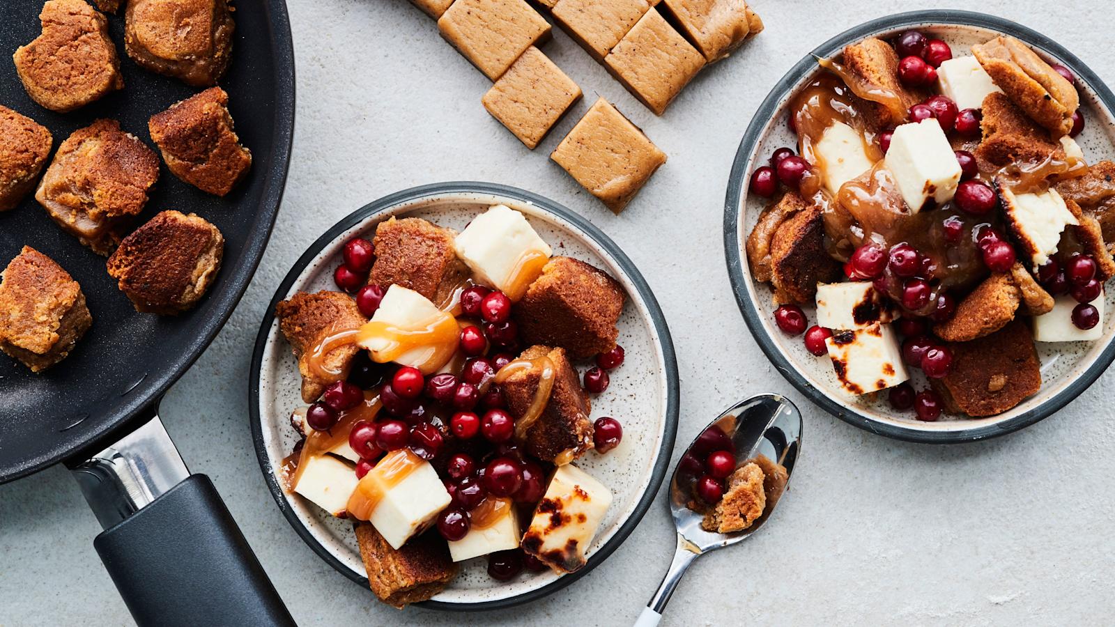 Näyttävään mutta vaivattomaan piparijälkkäriin tarvitaan vain muutama lähikaupasta löytyvä aines. Makea ja rapea piparkakkutaikina yhdistyy pehmeään vaniljarahkaan sekä kirpeisiin puolukoihin. Kaiken kruunaa rosmariinilla maustettu kinuskikastike.