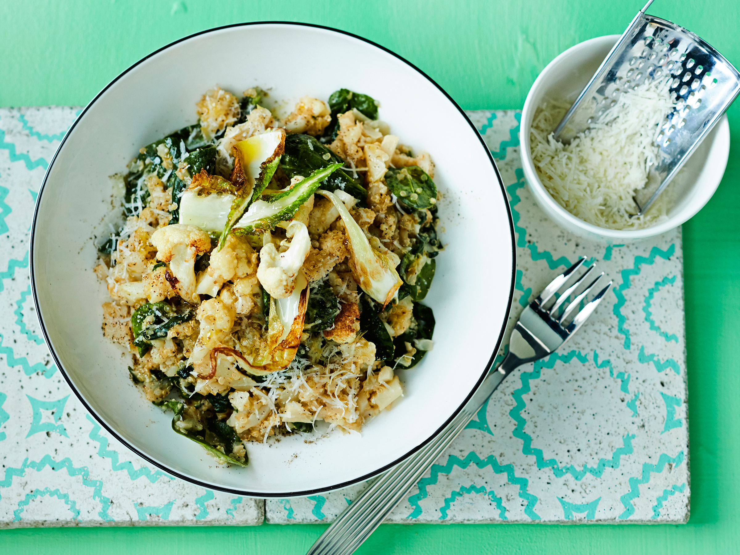 Paista kukkakaalin lehdet kukkakaali-kvinoarisoton joukkoon.