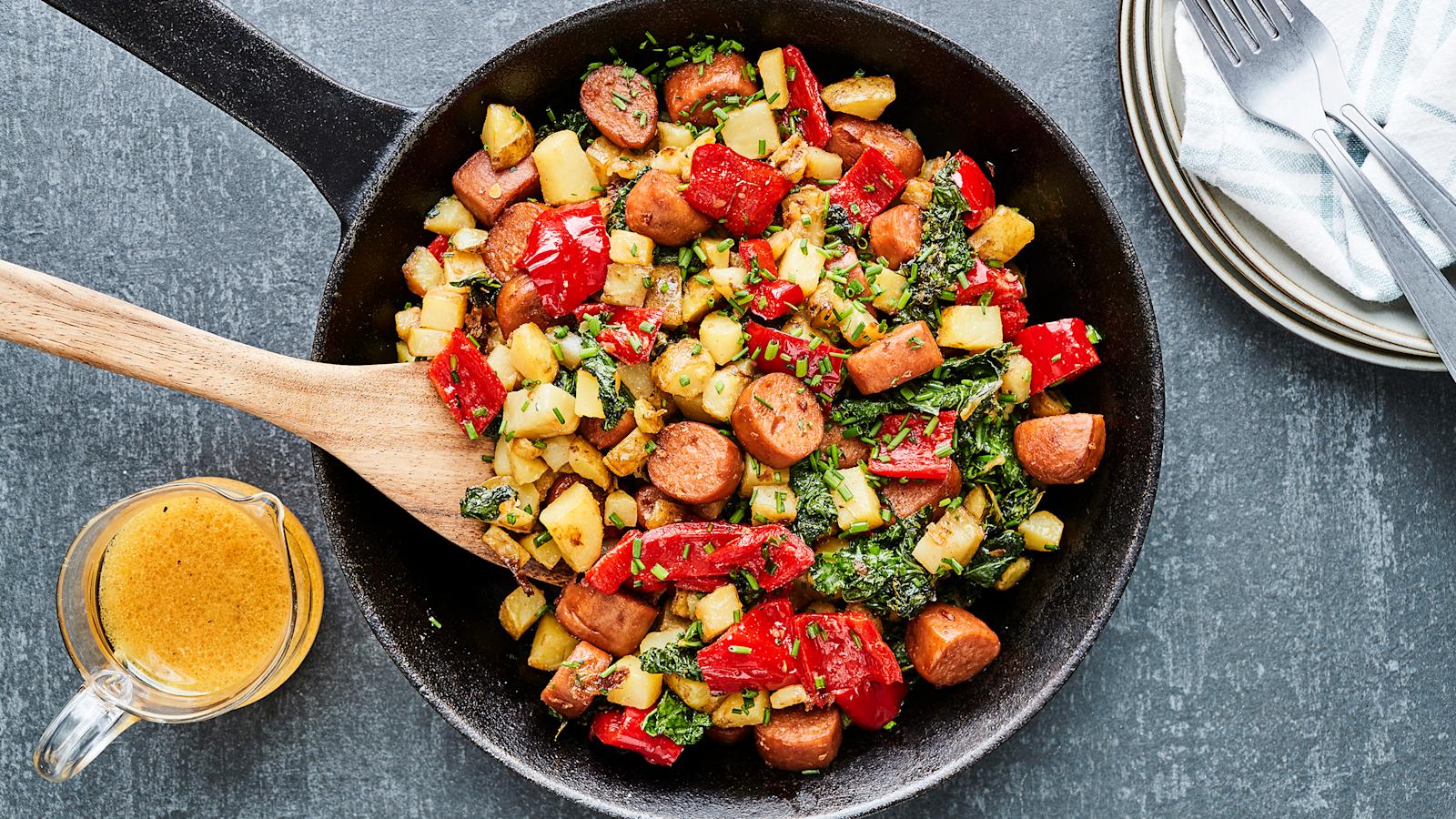 Jos teet munakkaan, raasta munaseoksen joukkoon juustoa ja pilko mukaan kylmäsavulohta, broileria, pyöryköitä tai nakkeja. Lisää pannulle myös kypsiä kasviksia ja perunaa pieneksi pilkottuna.