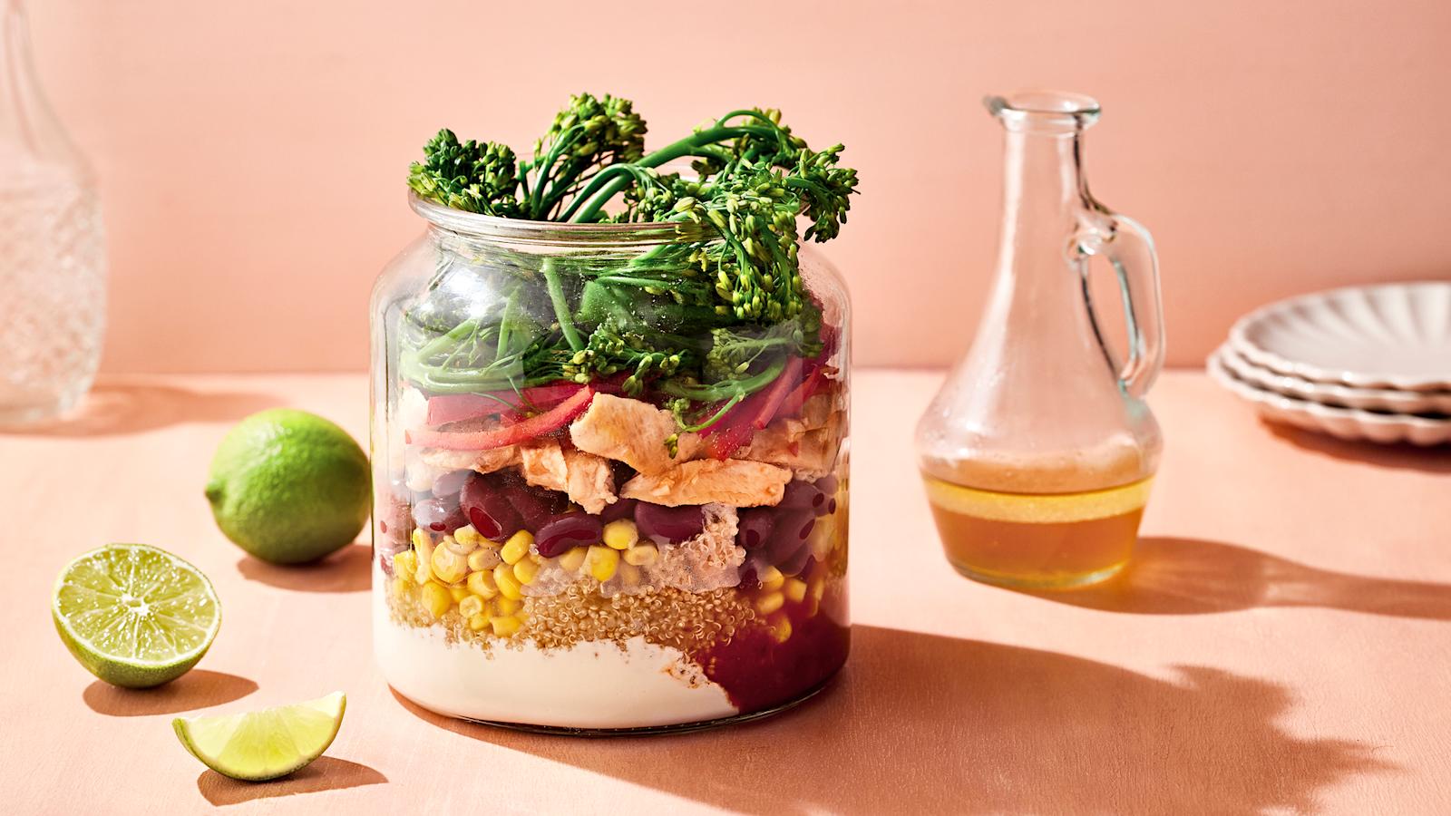 Jääkaapissa on usein keitettyä pastaa, joka on loistava pohja salaatille. Myös kuskus tai kvinoa sopii loistavasti salaattiin. Keitetty riisi toimii kulhon pohjalla.
