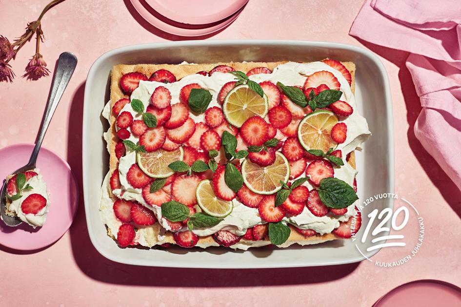 Koristele kakku muutamalla ohuen ohuella limeviipaleella sekä ripottelemalla pinnalle reilusti mansikoita ja mintunlehtiä.