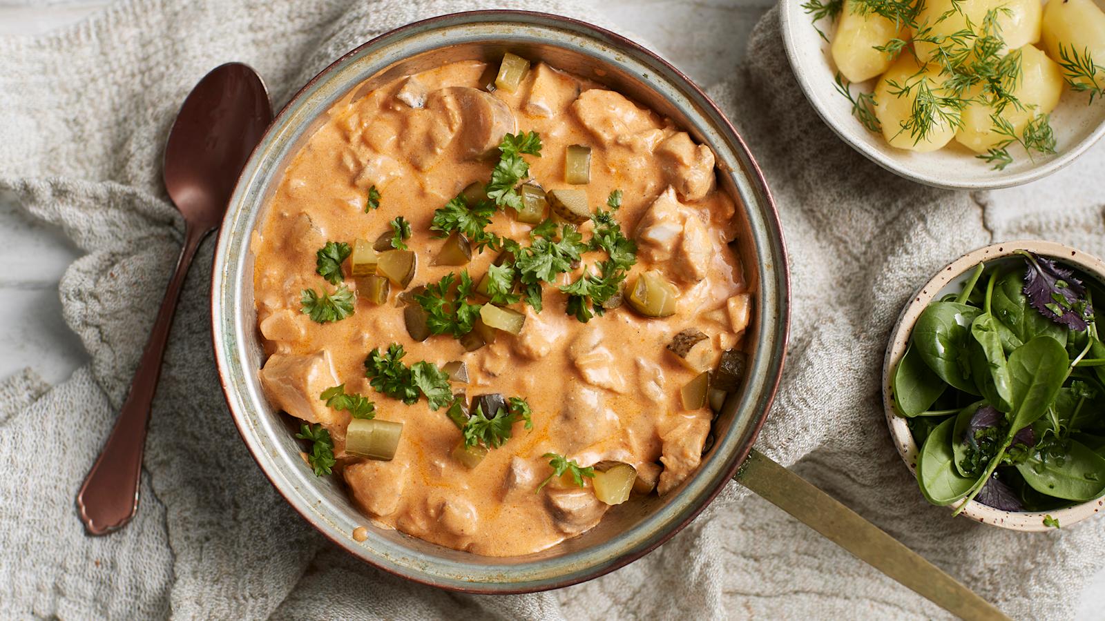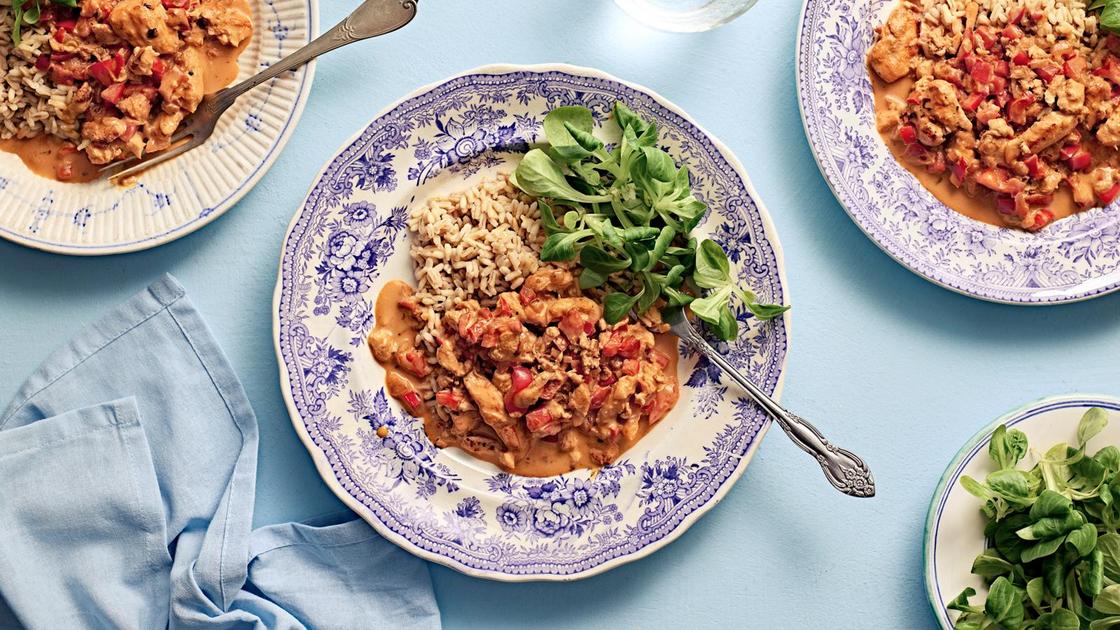 Perinteisestä kanakastikkeesta tulee entistä herkullisempi, kun lorautat joukkoon sweet chili -ruokakermaa. Kun teet kastikkeen valmiiksi marinoiduista fileesuikaleista, ei muita mausteita tarvita. Kastikkeen joukkoon pilkottu paprika tuo lisää kasviksia lautaselle kuin huomaamatta.