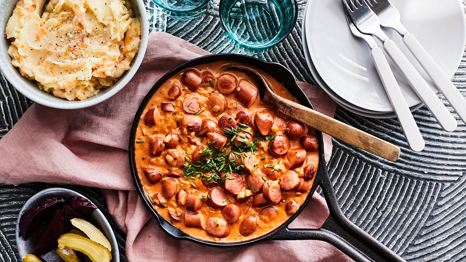 Tomaattipyreellä ja sinapilla maustettu kermainen nakkikastike maistuu monelle. Kastike valmistuu vartissa, kun käytät pakastesipulikuutioita. Kokeile myös vegeversiota vaihtamalla nakit kasvisnakkeihin ja kerma maustettuun kauraruokakermaan.