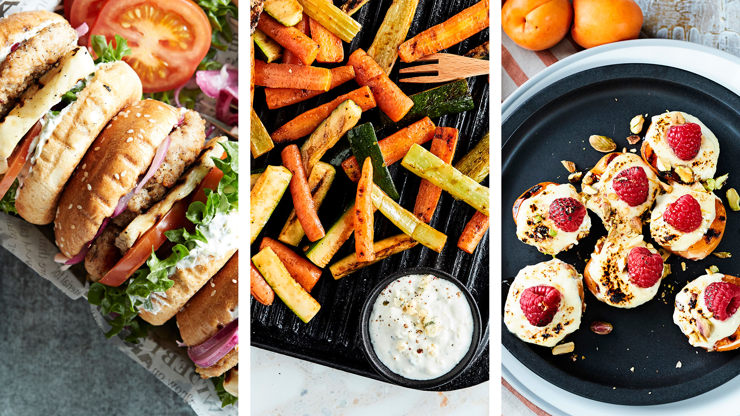 Halloumijuusto ja kanapihvi ovat nappivalinta herkullisen hampurilaisen väliin. Koko ateria valmistuu grillissä – tarjoile burgereiden lisukkeena grillatut kasvistikut ja jälkiruoaksi pehmeäksi paistuneet aprikoosit mascarponetäytteellä.