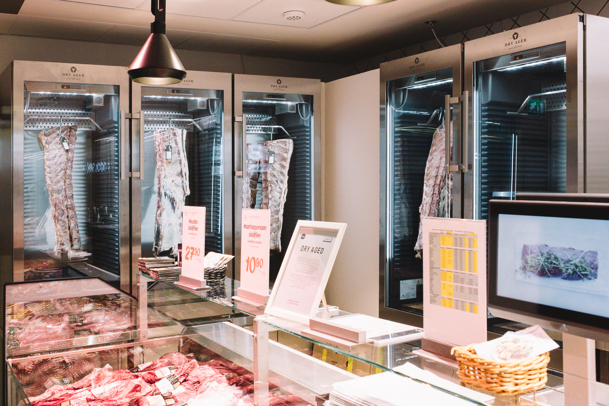 Food Market Herkun yksi uutuus löytyy kala- ja lihatiskin takaa kaupan perältä. Lasikaapeissa roikkuu lihaa kuivumassa ja kypsymässä – hieman samaan tapaan kuin juustot kypsyvät kellareissaan.