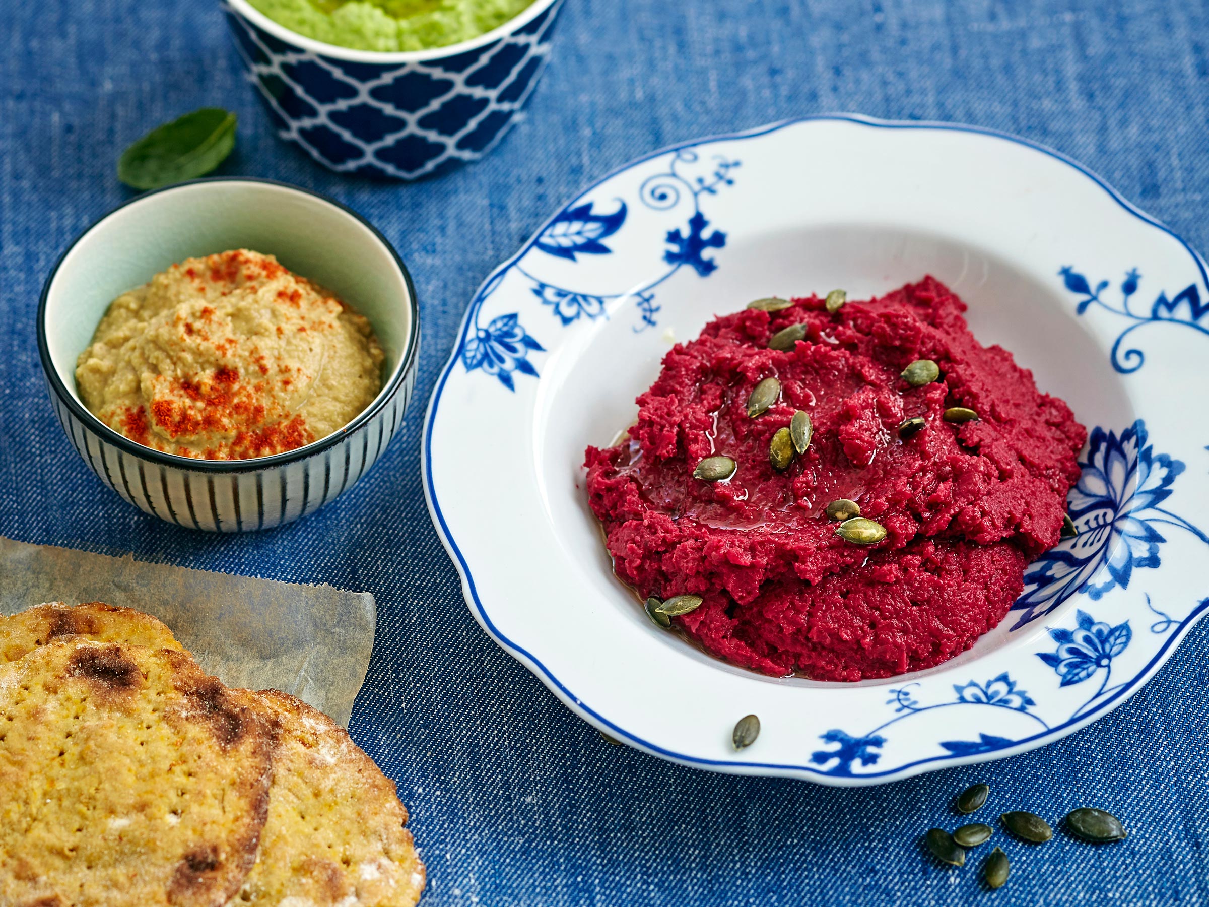 Lähi-idän keittiö on tahnojen juhlaa. Perinteinen hummus valmistetaan kikherneistä, mutta kokeile vaihteeksi papuja, pakasteherneitä tai punajuurta.