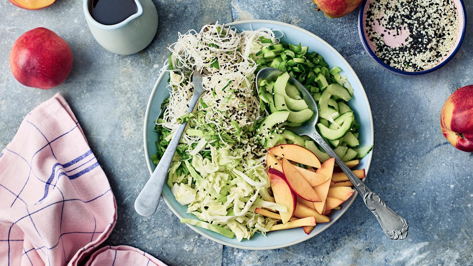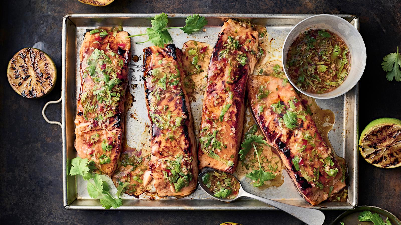 Keskikesän juhlan pääruokana maistuu grillattu lohi ja varhaiskaalisalaatti. Makean tulinen marinadi ja lohen kanssa tarjottava kastike vievät kalan makumaailman Aasiaan. Grillaus tuo ihanan aromin loheen, mutta voit kypsentää kalan myös uunissa. Lohen pariksi sopii varhaiskaalista ja ohuista nuudeleista tehty salaatti, jossa toistuvat aasialaiset maut.