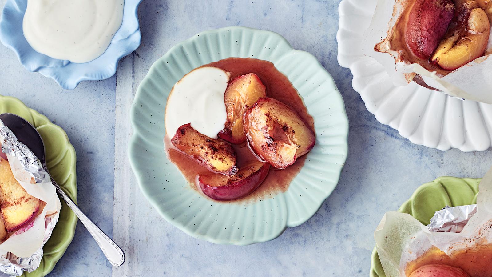 Vaniljaisen ranskankerman kanssa tarjottavat gillatut nektariinit ovat maukas päätös juhannusaterialle. Grillaa kanelilla, sokerilla ja siirapilla maustetut nektariinit folionyyttien sisällä, niin saat talteen myös ihanan liemen, joka muodostuu grillauksen aikana. Tämän herkun voit valmistaa myös uunissa.