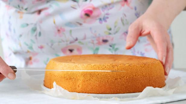 Katso videolta kuinka kakkupohja leikataan ja täytetään. Käytä leikkaamisessa sahalaitaista veistä. Kakun kostukkeena voi käyttää esimerkiksi makuvettä, limonadia, mehua, kahvia tai maitoa.