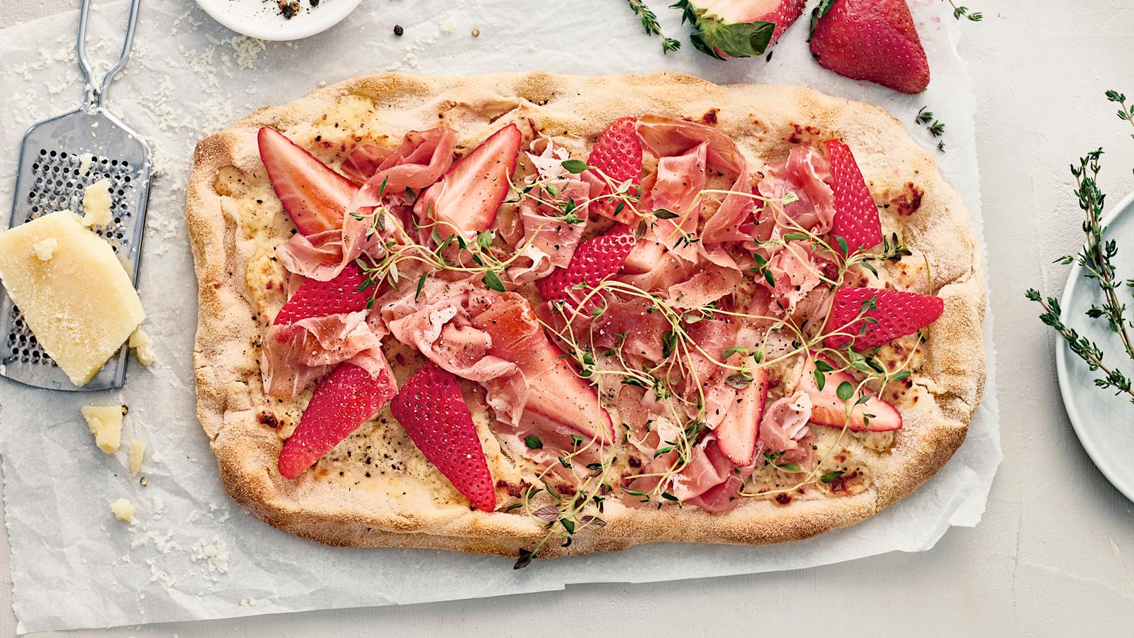 Kesäinen pinsa saa pinnalleen mansikoita, tuoretta timjamia ja ilmakuivattua kinkkua. Tämä hämmästyttävän hyvä kombo yhdistetään valkoiseen kastikkeeseen, jonka maku muistuttaa cacio e pepe pastaa.
