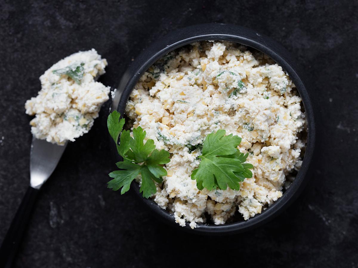 Kun murustat tofua rasvalevitteen joukkoon, saat proteiinipitoisen levitteen, joka muistuttaa munavoita. Joukkoon voi lisätä muussattuja kikherneitä, sekä hienonnettuja yrttejä.