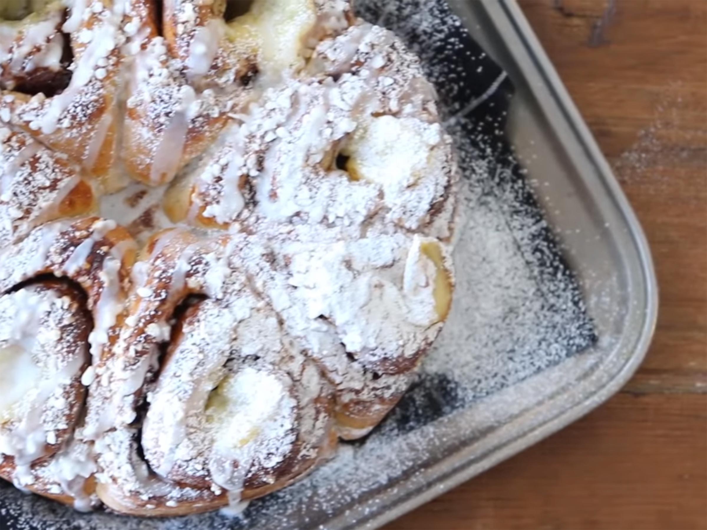 Valmista ensin kanelikierteet. Asettele kanelikierteet kehäksi leivinpaperoidun irtopohjavuoan reunoille. Lisää vaniljakreemiä pullan väleihin pursottimella. Voitele kananmunalla ja ripottele pintaan raesokeria. Kohota 20 minuuttia. Paista 170 asteessa 45–60 minuuttia, tarvittaessa peitä pinta leivinpaperilla, jos se saa liikaa väriä paiston aikana. Anna jäähtyä hetken ja nosta pois vuoasta. Koristele sokerikuorrutteella ja tomusokerilla.