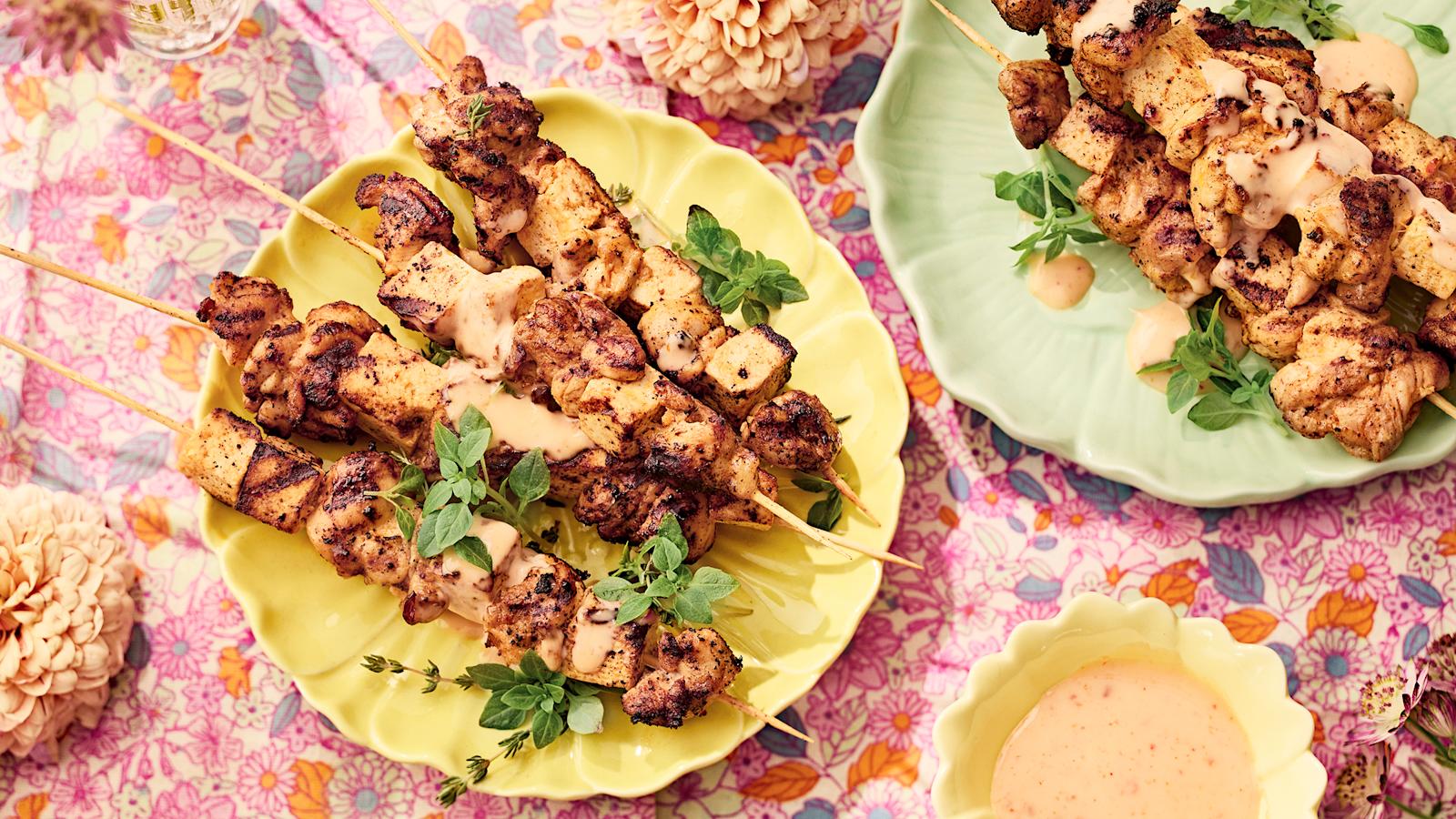 Pujota varrastikkuihin kanan lisäksi myös tofua. Sekoita vartaille trendikäs, aasialaisesta keittiöstä maut lainaava bang bang -kastike. Majoneesipohjainen kastike saa tulista makua srirachakastikkeesta sekä makeasta chilikastikkeesta.