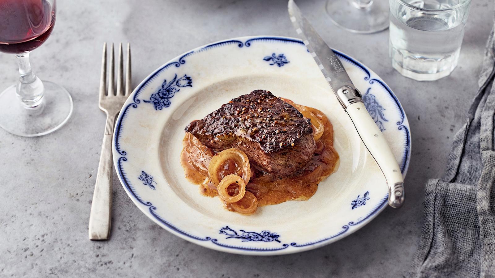 Ihanat ulkofileepihvit saavat seurakseen pannulla haudutettua sipulia. Kokeile ruskistaa sipulirenkaita voissa. Lisää joukkoon lihalientä ja sinappia, ja hauduta sipulit pehmeiksi. Kun sipulia kypsennetään, mausta tulee täyteläinen ja aavistuksen makea. Lopputulos sopii pihvien kylkeen täydellisesti.