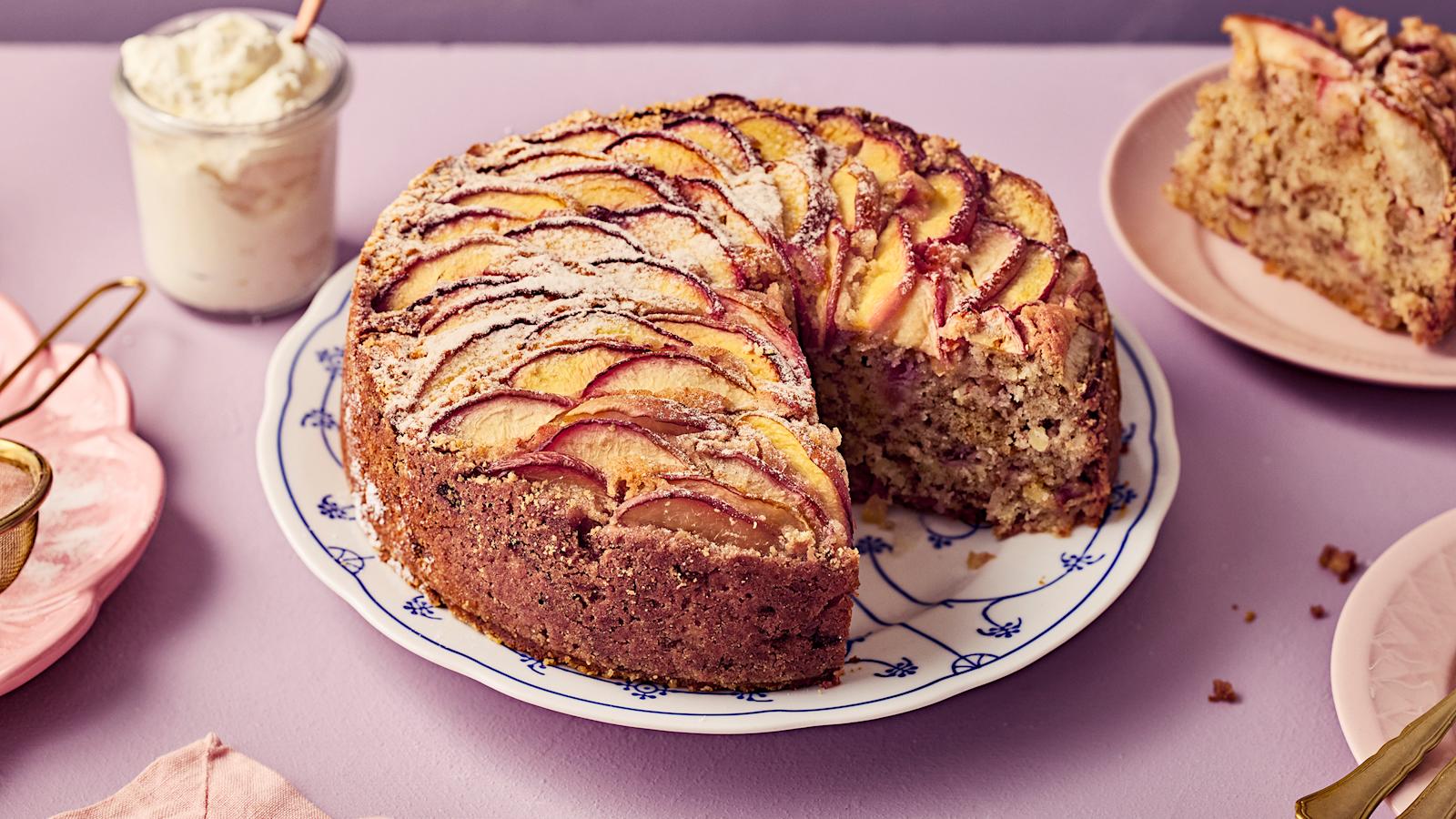 Upota rasiallinen kypsiä, mehukkaita nektariineja muhkeaan kakkuun. Sekoita osa nektariineista kanelilla kuorrutettuina paloina taikinaan ja lisää joukkoon mantelirouhetta, jolloin saat kakkuun kivaa suutuntumaa. Koristele kakku vielä viipaloiduilla nektariineilla. Viimeistelyyn riittää kevyt tomusokerihuntu. Kakku maistuu ihanalta sellaisenaan, mutta jos kaipaat pientä ekstraa, tarjoile lisänä vaniljajäätelöä tai -kastiketta.