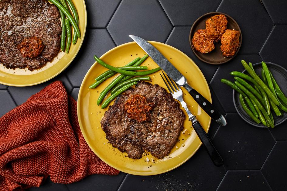 Kasvissyöjille ja vegaaneille sopivat vegepihvit valmistetaan kasvipohjaisesta jauhiksesta samalla menetelmällä. Pihvin kruunaa trendikäs cowboy butter, joka saa makunsa valkosipulista, yrteistä, sitruunasta, sinapista ja savupaprikasta.