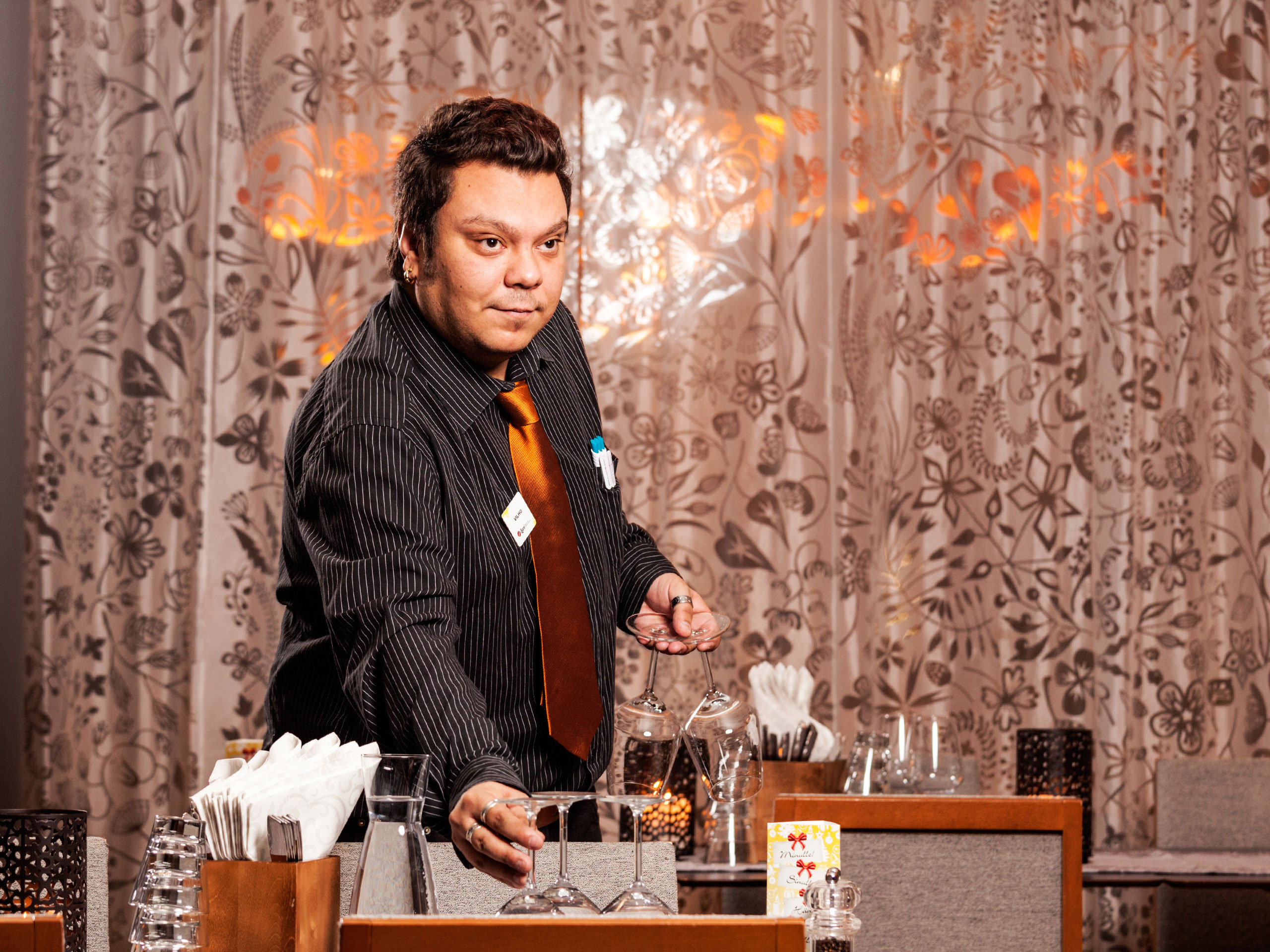 Tarjoilija ei ole pelkkä tilausten vastaanottaja ja annosten pöytiin tuoja. Meidän vastuullamme on saada asiakkaat tuntemaan olonsa kotoisiksi heti, kun he saapuvat ravintolaan. Meillä on ravintolassa rento tunnelma, ja syömään saa tulla halutessaan vaikka hiihtomonoissa.