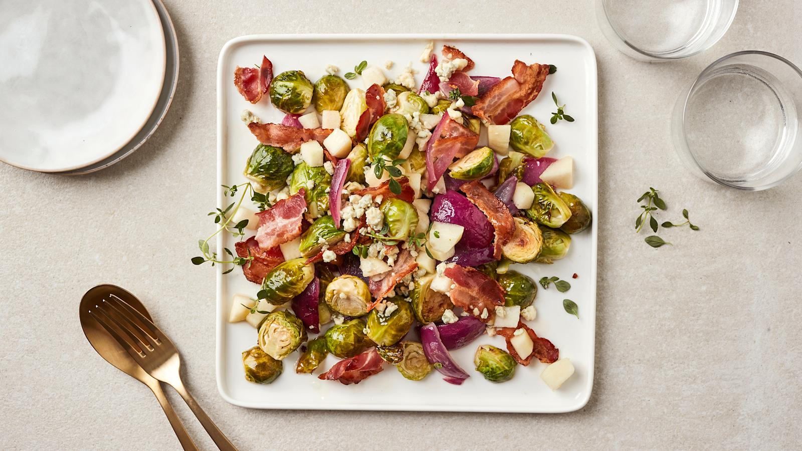 Talvinen ruokaisa salaatti tehdään näppärästi uunissa paahtamalla. Tässä salaatissa pekoni ja sipuli saavat rinnalleen ruusukaalin. Korosta herkullista suolaisen ja makean liittoa lisäämällä joukkoon vielä päärynää ja sinihome- tai fetajuustoa.