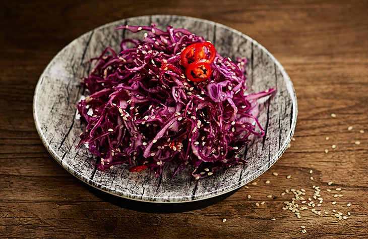 Leikkaa punakaali oikein ohuiksi suikaleiksi ja sekoita salaatin joukkoon kurpitsasalaattia tai appelsiinipaloja, pilkottuja taateleita, rusinoita, jäisiä puolukoita, hillosipuleita tai saksanpähkinöitä sekä paahdettuja siemeniä ja sekoita kastikkeeksi vaikka sitruunainen sinappikastike.