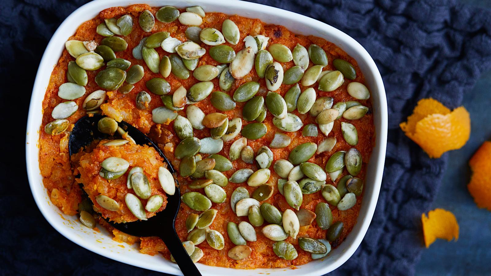 Oikaise joulun valmisteluissa ja tuunaa valmislaatikosta astetta herkullisempi appelsiinilla ja vaahterasiirapilla. Tummanvihreät kurpitsansiemenet korvaavat korppujauhon laatikon pinnalla ja lopputulos on ihanan rouskuva!