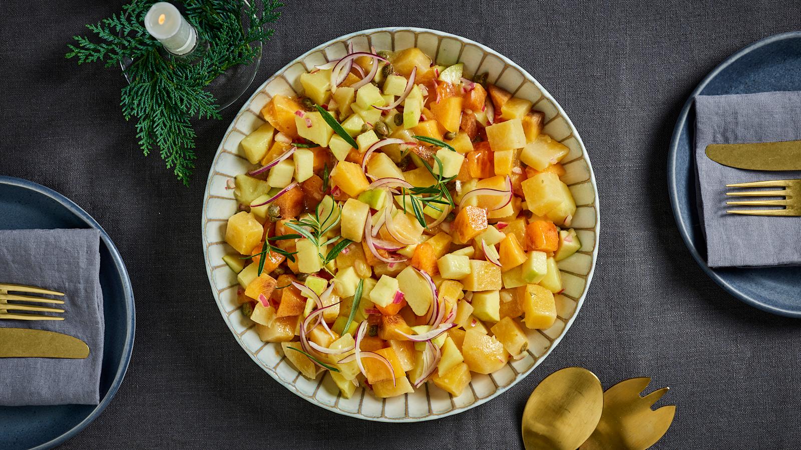 Pue rosolli tänä jouluna vaaleaan! Vaalea rosolli on yhtä helppo ja nopea valmistaa kuin joulunpunainen esikuvansakin. Lantusta, persimonista ja omenasta valmistettu versio on ihanan makea ja raikas vaihtoehto perinteiselle rosollille. Vaalean rosollin maustaa kirpsakka punasipulivinegretti ja tuore rosmariini.