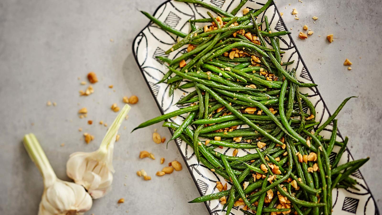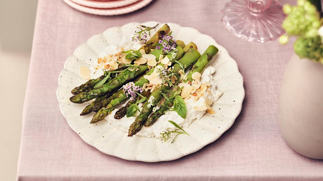 Mikä upea alkupala! Vaahdota vegaanisista salaattikuutioista ja kaurafraichesta peti paistetuille tankoparsoille. Viimeistele raikas herkku mantelilastuilla ja tuoreilla yrteillä.