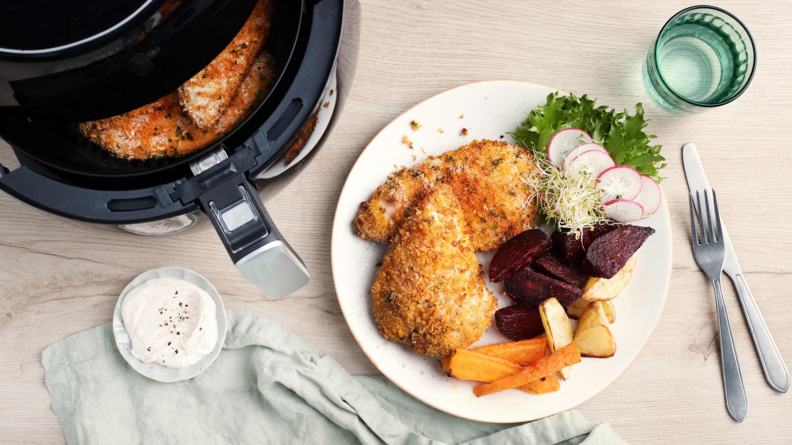 Kananugetit voi valmistaa airfryerissa uppopaistamista terveellisemmin. Nugetit kannattaa kypsentää parissa erässä riippuen airfryerin koosta. Lopputuloksena on pinnalta rapeita, sisältä meheviä naposteltavia. Tarjoa nugettien kanssa kasvistikkuja ja dippiä.
