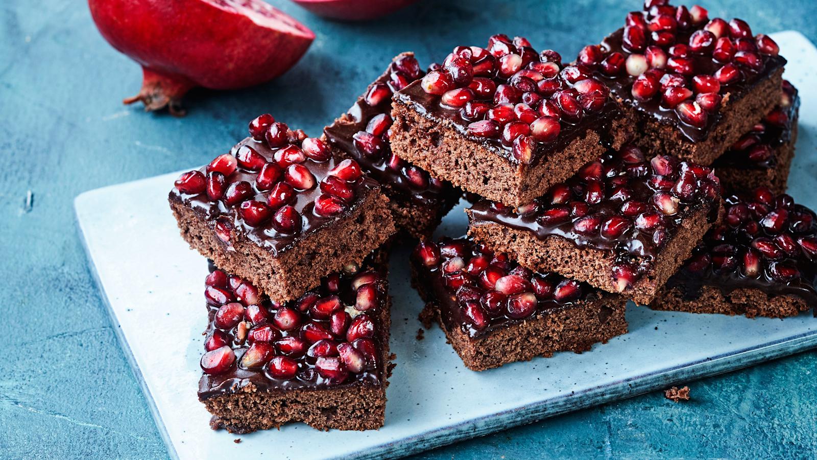 Taateleilla ja granaattiomenalla tuunatut mokkapalat sopivat erityisesti loppuvuoden juhliin. Käytä taateleita soseutettuna mokkapalojen pohjassa ja koristele leivonnaisen pinta granaattiomenansiemenillä.