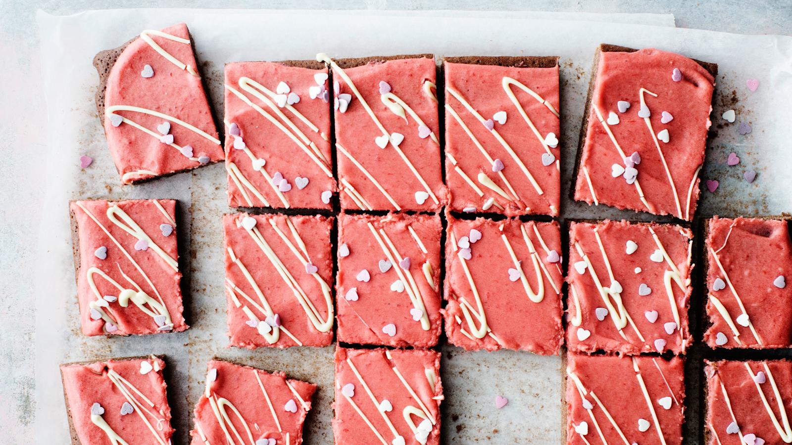 Hempeän vaaleanpunaisten mokkapalojen kuorrutteessa maistuu mansikka. Nämä mokkapalat ovat helppo leivottava myös lapsille, sillä taikina ja kuorrute valmistuvat sekoittamalla, eikä sähkövatkainta tarvita.