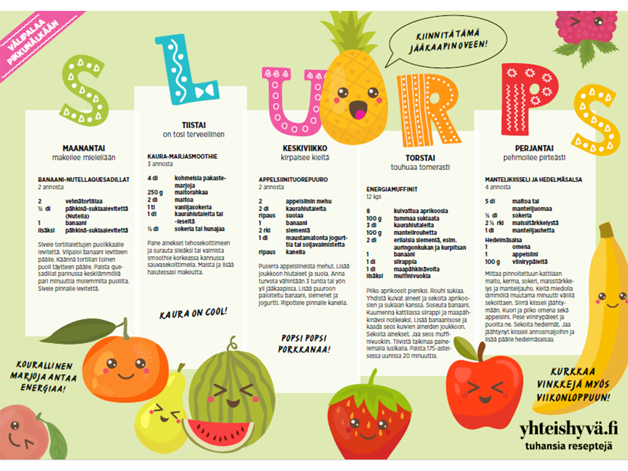 Yhteishyvän ja Mannerheimin Lastensuojeluliiton välipalaesite jaetaan ekaluokkalaisille monessa koulussa. Ellei sinun koululaisesi saanut omaa, tulosta se tästä.