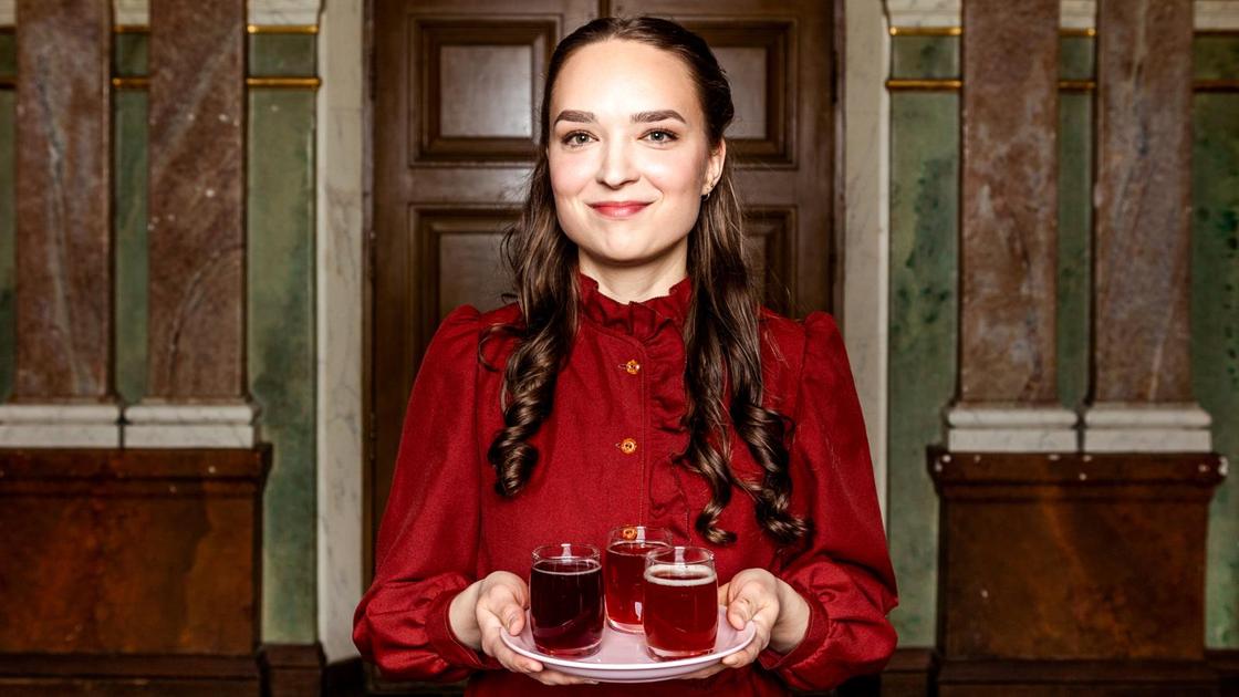 Anemone Aaltonen käsissään lautanen, jolla on kolme pientä lasillista tummaa juomaa