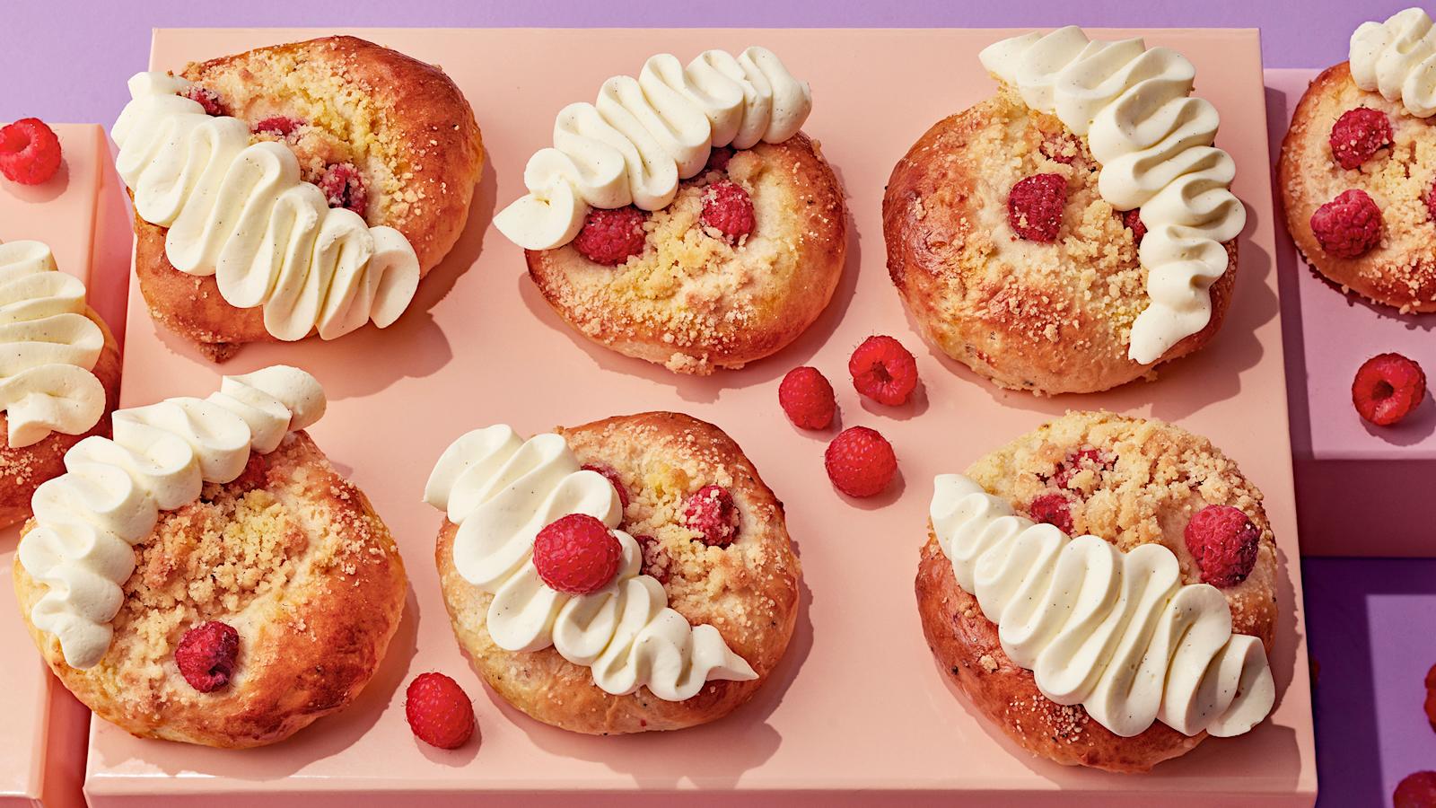 Vadelmia, vaniljaista tuorejuustovaahtoa ja rapeaa murua – eikö kuulostakin ihanalta! Täytä pikkupullat vadelmilla ja muruseoksella ennen paistoa ja viimeistele pursottamalla vaniljainen vaahto jäähtyneiden pullien päälle.