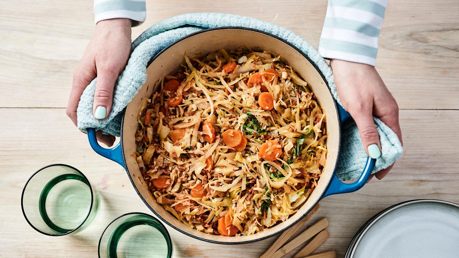 Uuniton kaalilaatikko kypsyy liedellä ilahduttavan nopeasti. Vegaaninen kaalipata saa makua siirapista, muskottipähkinästä ja soijakastikkeesta. Tähän kaalilaatikkoon tukevuutta tuovat kasvisjauhis ja kaura-ateriajyvät.