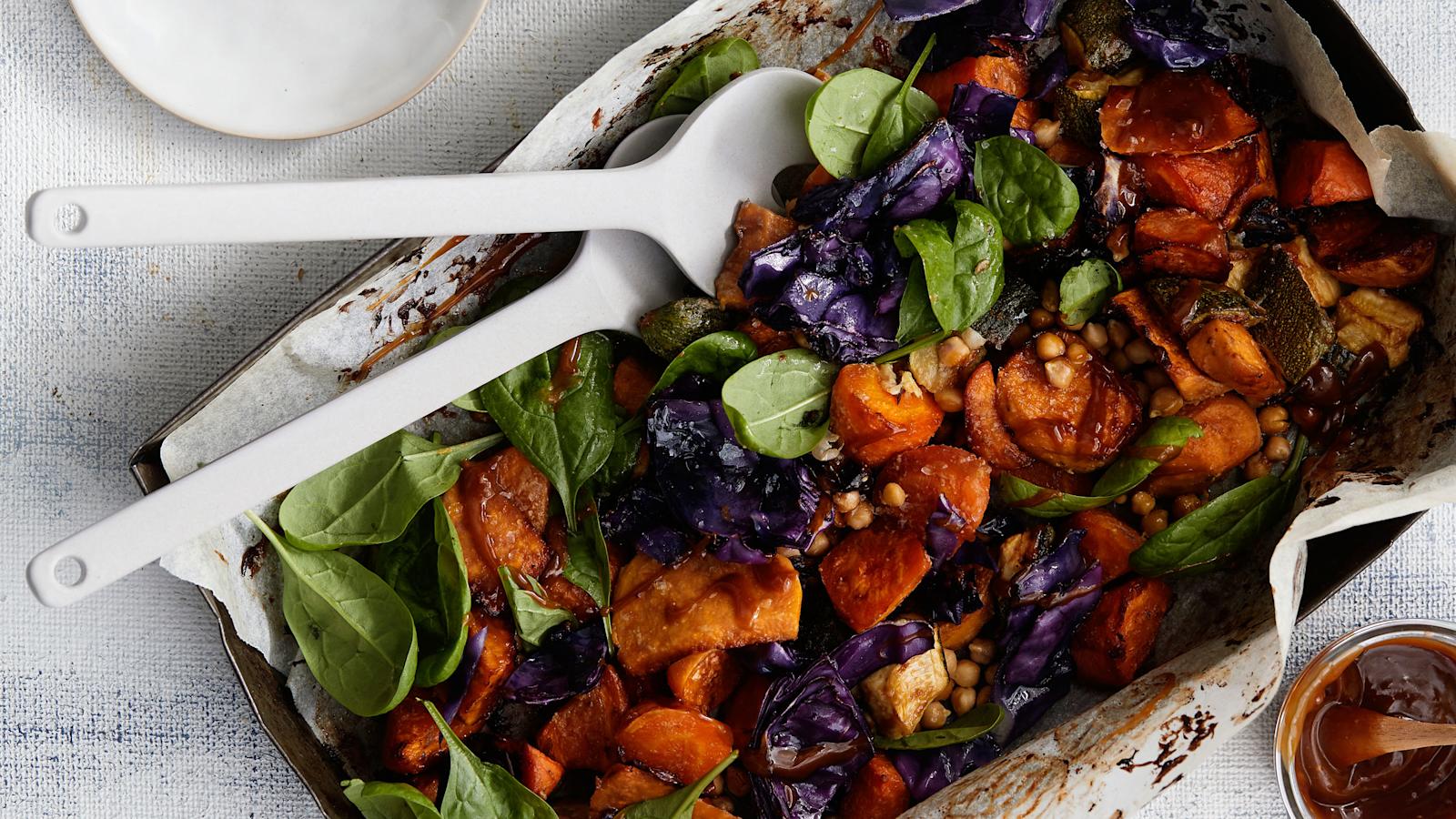 Anna kasvisten paahtua uunissa pehmeiksi, lisää sitten mukaan purkillinen kypsiä kikherneitä ja laita pelti hetkeksi takaisin uuniin, jotta kikherneet saavat hieman rapeutta. Viimeistele ruoka pinaatinlehdillä tai rucolalla sekä täyteläisellä maapähkinävoikastikkeella.