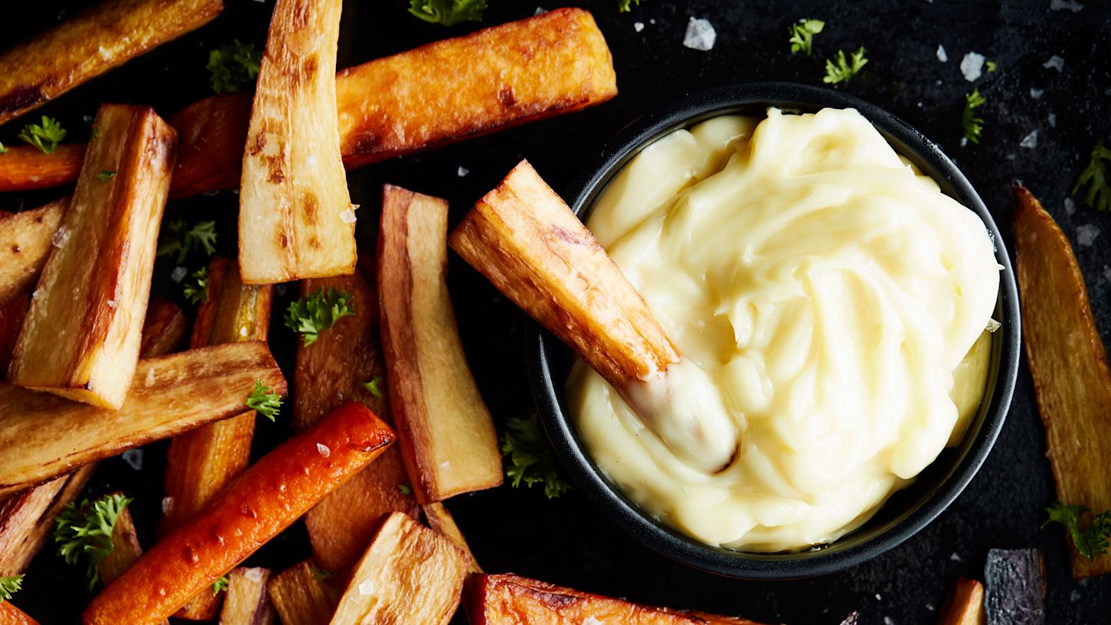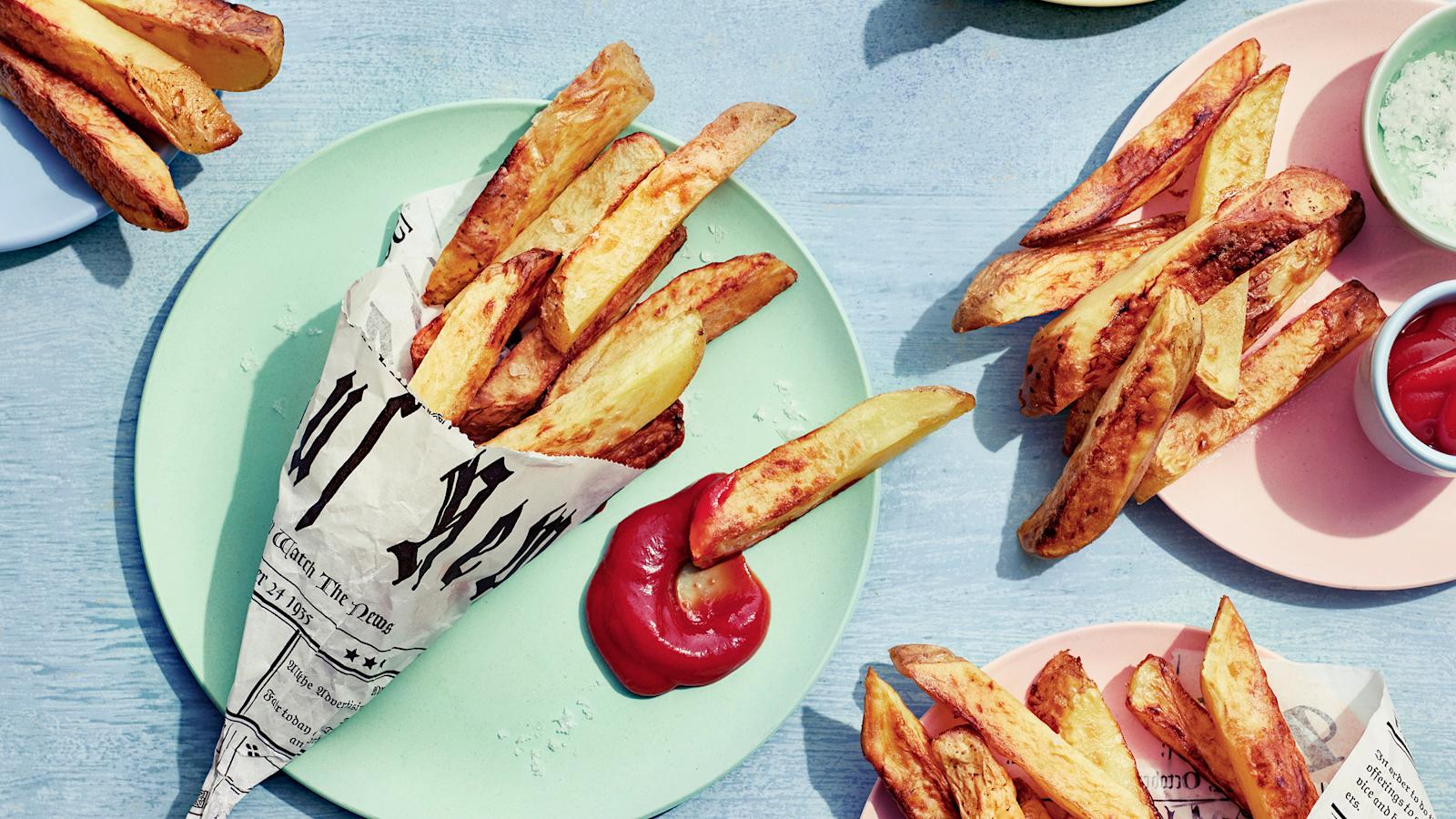 Ranskalaisia kelpaa syödä iltapalaksi vappuhulinoiden jälkeen. Voit ennakoida ja jättää tikuiksi pilkotut perunat vesikylpyyn jääkaappiin jo päivällä. Silloin illan tehtäväksi jää vain perunoiden maustaminen ja kypsentäminen.