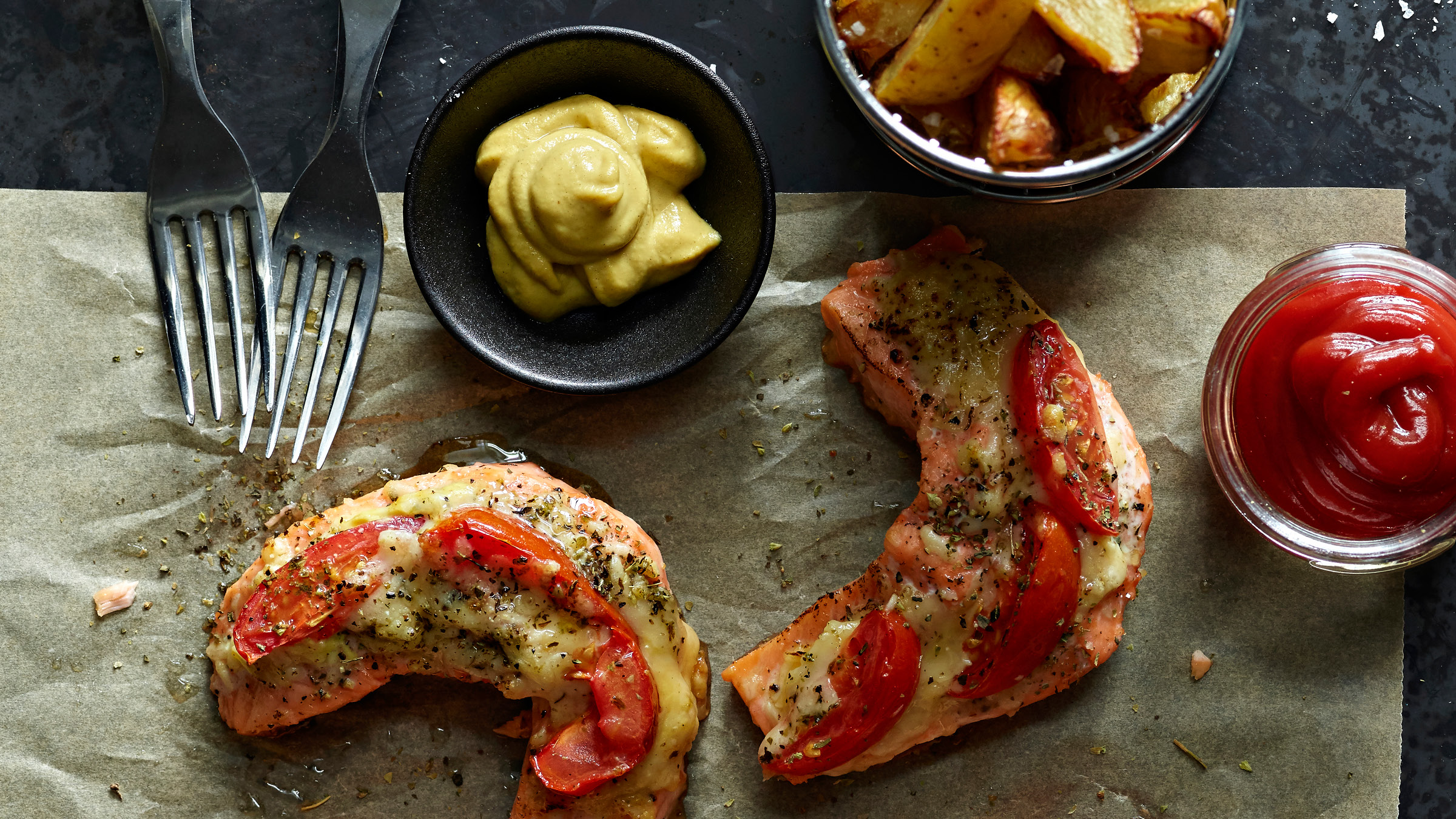 Leikkaa tomaatti lohkoiksi tai käytä puolitettuja minitomaatteja. Viimeistele ruoka yrttimausteseoksella tai oreganolla. Lohimakkarat paistuvat 190-asteisessa uunissa vartin verran.
