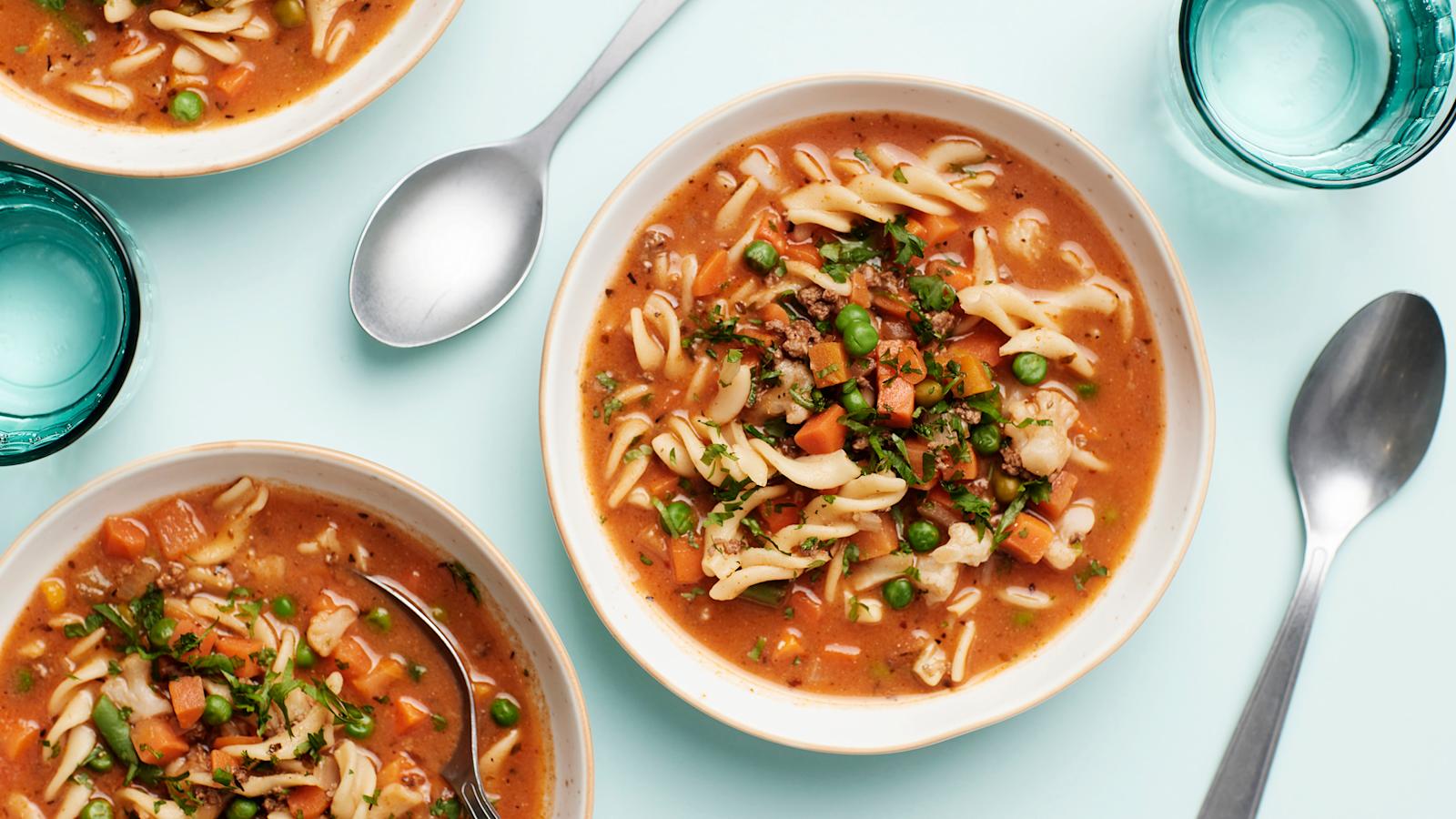 Jauheliha ja pasta ovat vakiotuotteita monen jääkaapissa. Valmista niistä nyt maukas, minestronea muistuttava keitto, joka saa rutkasti makua kuivatuista yrteistä. Reilu nokare sulatejuustoa tuo keittoon ihanaa täyteläisyyttä.