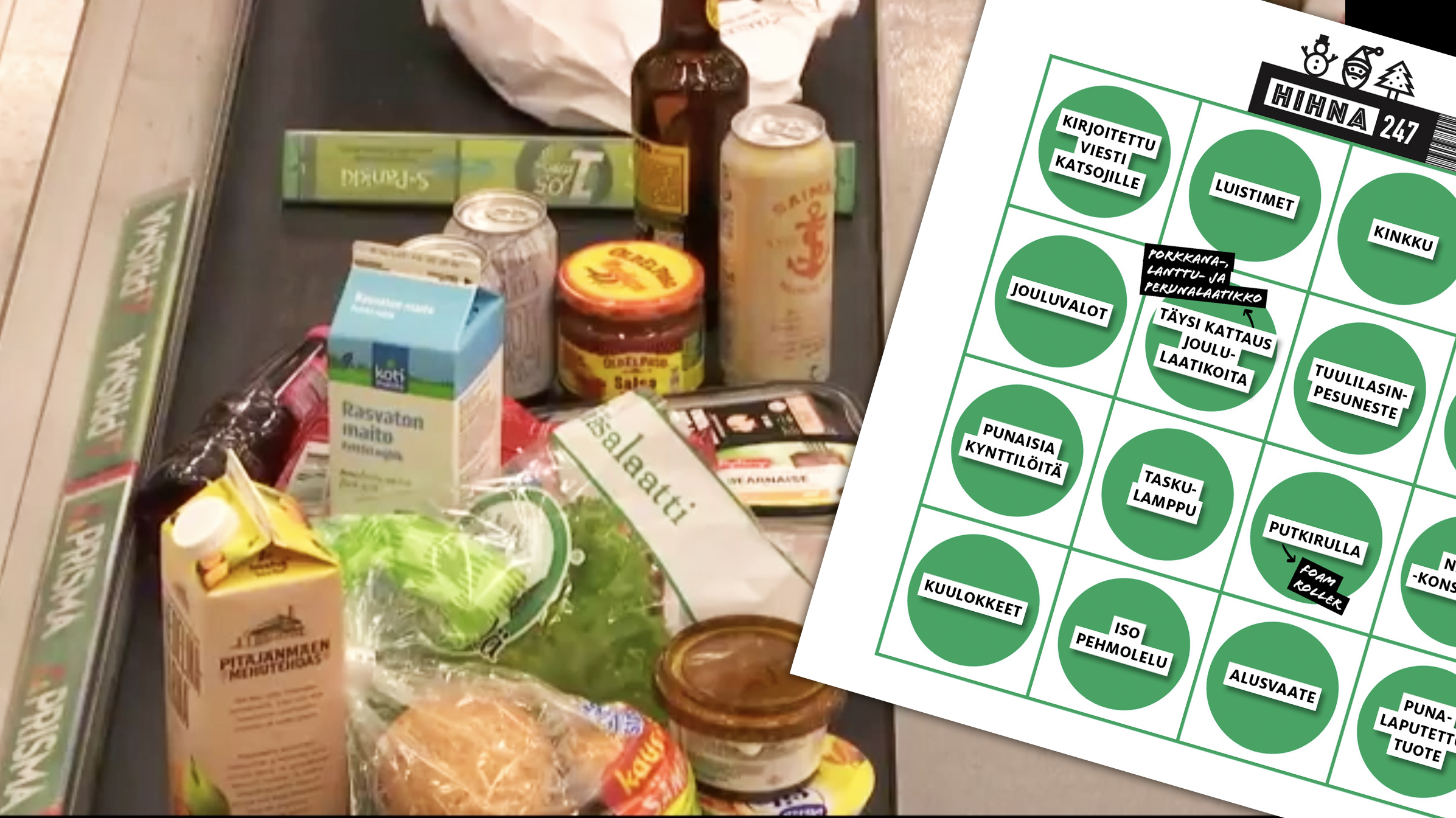 Prisma Kaaren kassa, jossa Jouluhihnaa kuvataan, on selkeästi merkitty. Näin lähetykseen päätyvät vain halukkaiden ostokset.