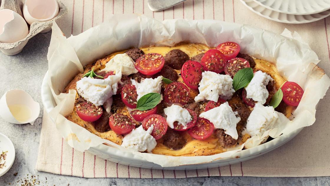 Uunimunakas valmistuu vähällä vaivalla. Se saa ruokaisuutta lihapullista, ja tomaatin, mozzarellan ja pizzamausteen yhdistelmä vie maut Italian suuntaan.